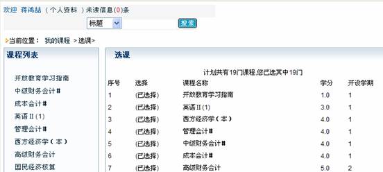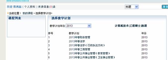 4.弹出“您还没有选课!”对话框,点“选择教学计划”,确定,选择自己的教学计划,选课,根据需要选择本学期的课程或所有课程(选修课程省电大是权威),确定。