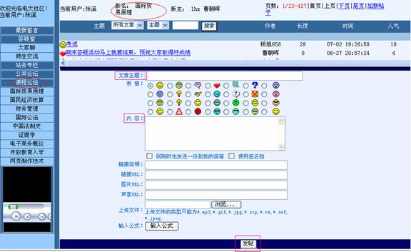 切换课程点“课程论坛”下的列表,发帖子输入文章主题、内容后即可发帖