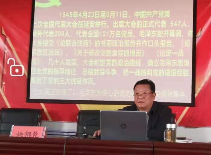 姚钢乾讲述了党的第七次全国代表大会召开的背景、原因及重大意义,解读了中华民族对历史存续与传承的高度重视,回顾了中国共产党波澜壮阔的革命奋斗史,列举了中国共产党带领中国人民创造的丰功伟绩。他要求,全体党员要通过学习活动,体会理想信念是中国共产党人奋斗的政治灵魂,知行合一是中国共产党人奋斗的优良传统,自我革命是中国共产党人奋斗的雄厚底气,精神谱系是中国共产党人奋斗的强大支柱。(撰稿:高琳)