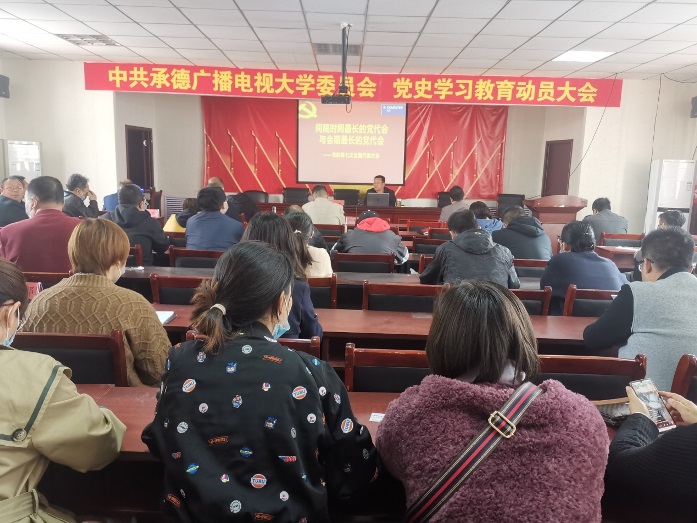 知史爱党,知史爱国,4月15日下午,承德广播电视大学党委开展党史学习教育系列活动之党委书记讲党课活动,党委书记姚钢乾以《间隔时间最长、与会期最长的党代会——党的第七次全国代表大会》为题,开展了一次别开生面的党课宣讲。学校全体党员参加会议。