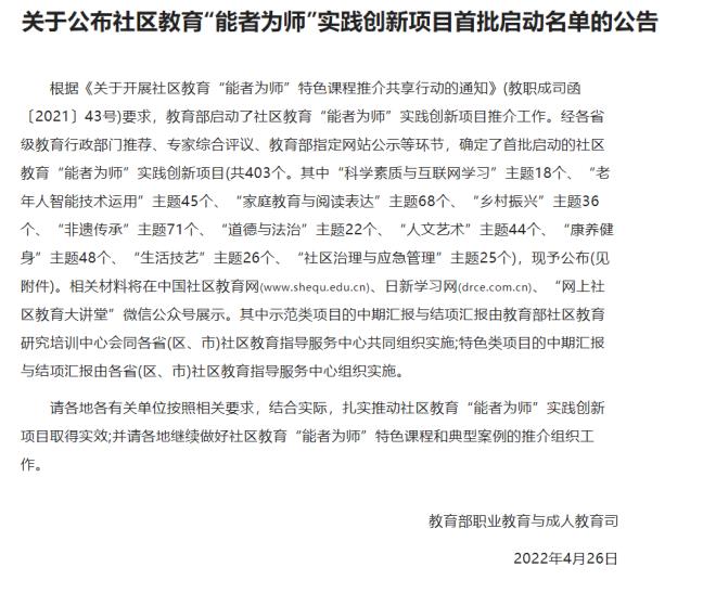 近日,教育部职业教育与成人教育司根据《关于开展社区教育 “能者为师 ”特色课程推介共享行动的通知》(教职成司函〔 2021 〕 43 号)要求,将社区教育 “ 能者为师 ” 实践创新项目首批启动名单予以公示 (共403个)。乐竞体育(中国)官方网站申报的《百师进千家 育万人心》入选社区教育“能者为师”实践创新示范项目(“家庭教育与阅读表达”主题)。