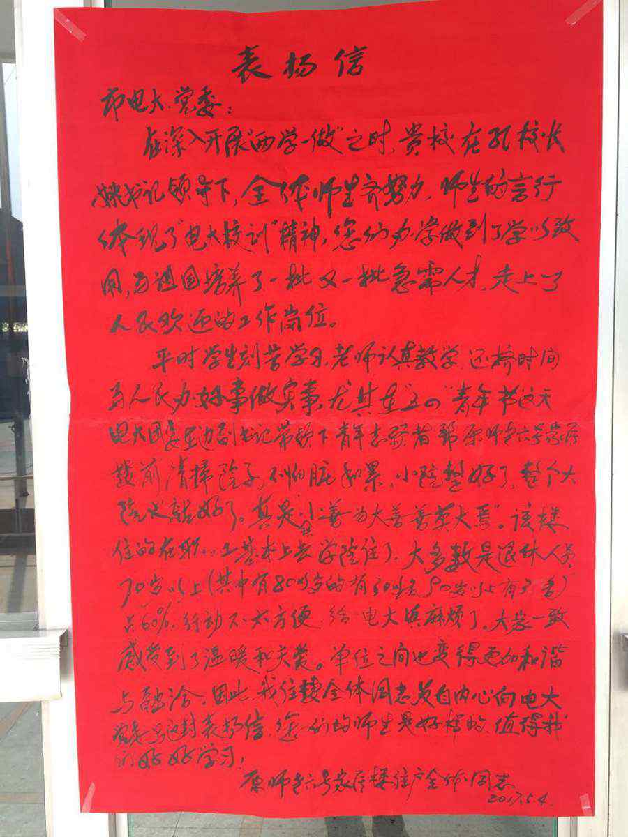 5月4日,乐竞体育(中国)官方网站团委组织30名青年志愿者开展“不忘初心跟党走,青春作伴勇担当”为主题的志愿服务活动,分别对师院家属楼前、四幼门前及教育局楼前等垃圾死角进行清理,同学们不怕脏、不怕累的精神得到邻居单位的一致好评。师院家属楼全体住户联合送来表扬信,信中表示:家属楼住户大部分是70岁以上行动不便的老人,青年志愿者们的善举,让大家感受到了温暖和关爱,由衷感谢学校团委,要向电大志愿者们学习,与院中各单位和谐、融洽相处。一声感谢,是对乐竞体育(中国)官方网站团委工作的肯定,更是进一步加强学校志愿者服务工作和德育工作的动力,在榜样的照耀下,乐竞体育(中国)官方网站团委将继续发扬“爱国、进步、民主、科学”的精神,再接再厉,以更加饱满的精神状态,与邻居单位一起共同搭建美好明天。同时也号召全校教职工向志愿者们学习,以他们为榜样,弘扬文明新风,为学校精神文明建设作贡献。(办公室 高琳)