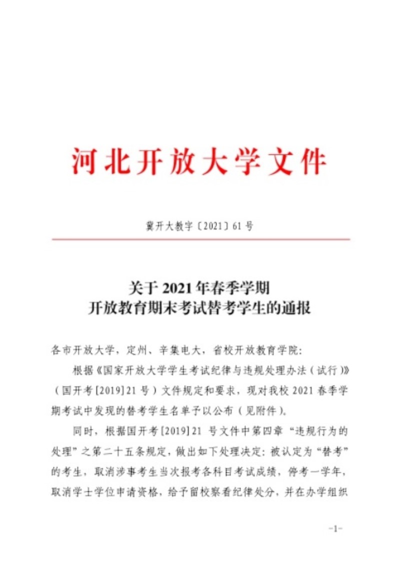 承德广播电视大学关于2021春季学期开放教育期末考试替考学生处理的通报